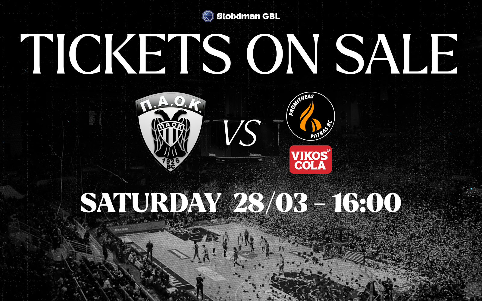 Η ΚΑΕ ΠΑΟΚ ανακοινώνει ό,τι ξεκίνησε η διάθεση των εισιτηρίων και για τον αγώνα ΠΑΟΚ – Προμηθέας ΒΙΚΟΣ Cola που θα διεξαχθεί στο PAOK Sports Arena το Σάββατο (28/3) στις 16:00 για την 23η αγωνιστική της Stoiximan GBL.