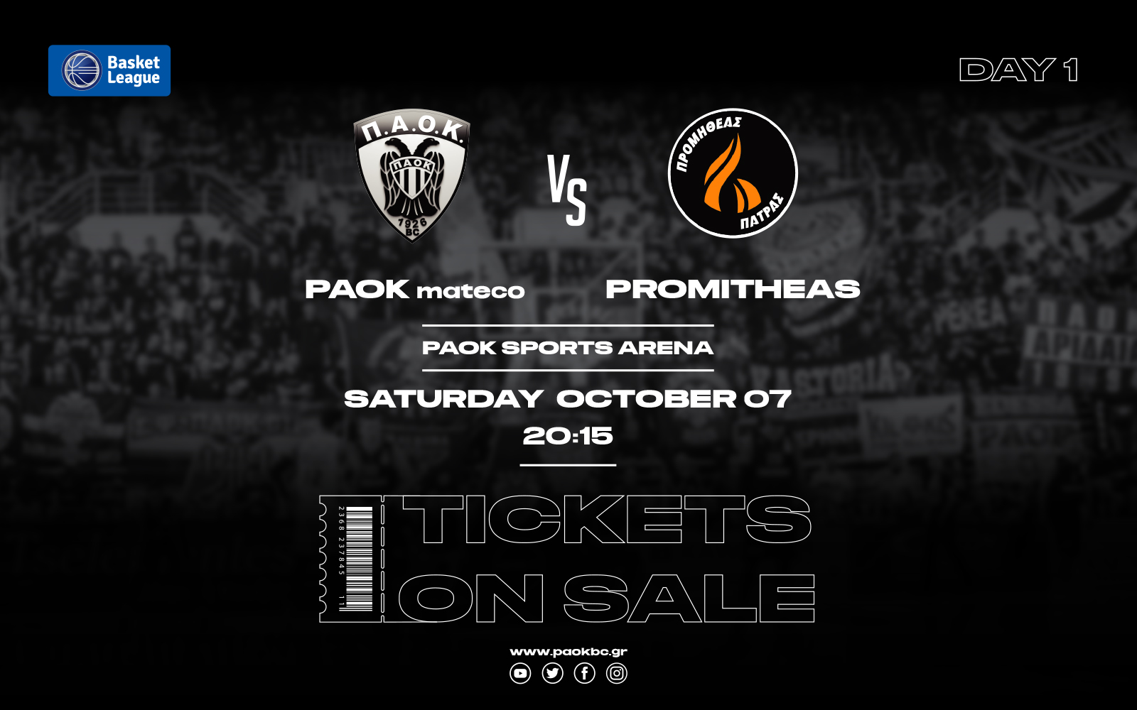 Το νέο πρωτάθλημα μπάσκετ ξεκινά και από σήμερα είναι διαθέσιμα τα εισιτήρια για τον αγώνα ΠΑΟΚ mateco – Προμηθέας Πάτρας, που θα διεξαχθεί στο PAOK Sports Arena, το Σάββατο 7 Οκτωβρίου 2023, στις 20:15, για την 1η αγωνιστική της Basket League.